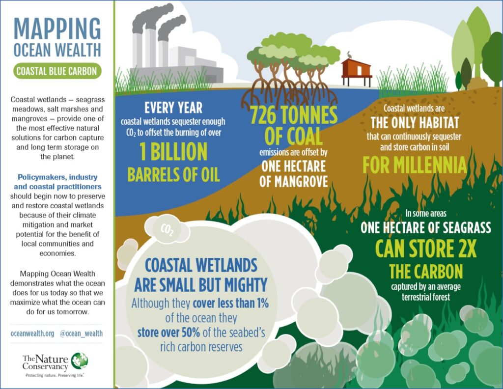 Source: OceanWealth Despite their importance, coastal blue carbon habitats are among the most vulnerable ecosystems on the planet. The natural, pre-industrial breadth of coastal wetlands has fallen by over half during the nineteenth century, at a rate four times that of tropical forest cover reduction. Current estimates of annual losses range from 0.5 percent to 3 percent. Coastal ecosystem degradation is typically caused by the removal of mangrove forests, urban and industrial coastal development, pollution, and agricultural and aquaculture pressures. While its presence boosts a better environment, its loss accounts for higher emissions. Blue carbon habitats are sources of greenhouse gas emissions due to their high carbon content when lost or degraded. Current carbon losses from blue carbon habitats are estimated to account for up to 19% of worldwide deforestation emissions.[3]