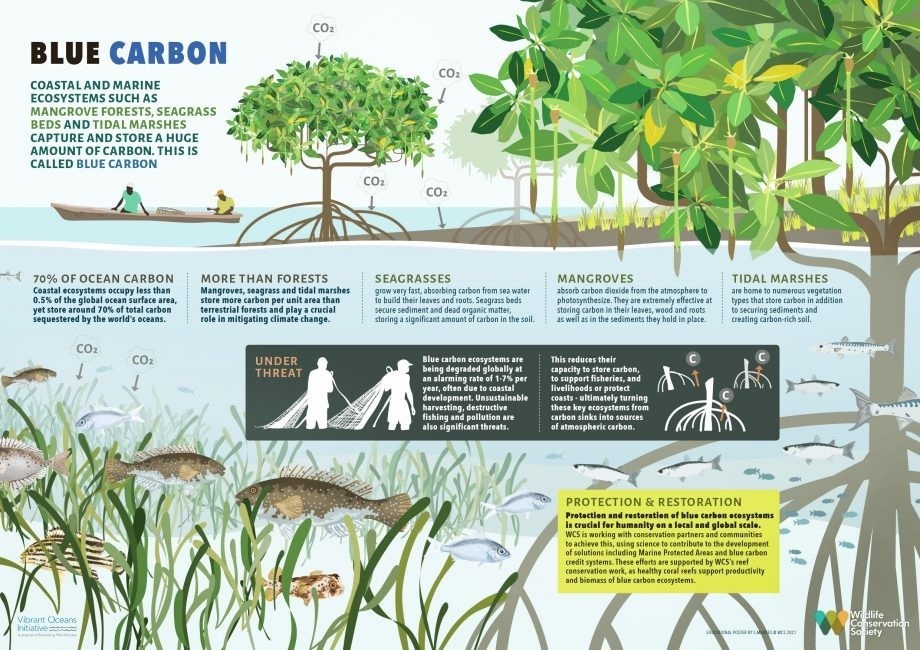 UNESCO explains blue carbon to be the organic carbon deposited in coastal and marine ecosystems. Mangroves, tidal and salt marshes, and seagrasses are exceptionally productive coastal ecosystems noted for their capacity to store carbon in the form of vegetation and sediments below.[1]